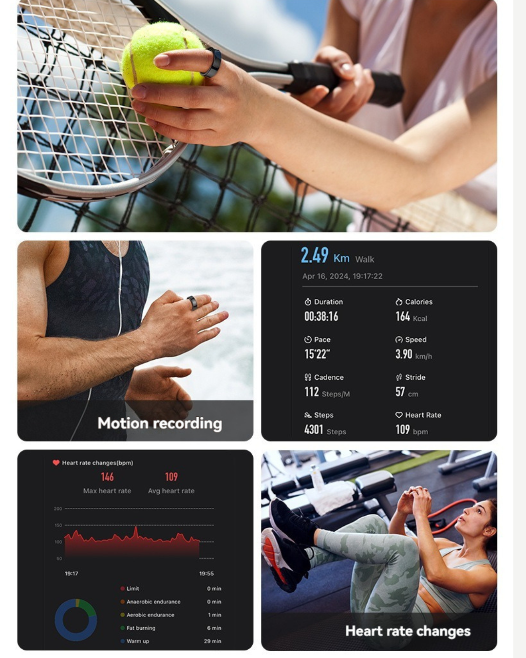 الخاتم يدعم أوضاع متعددة للتمارين مثل المشي، الجري، ركوب الدراجة، والسباحة وغيرها